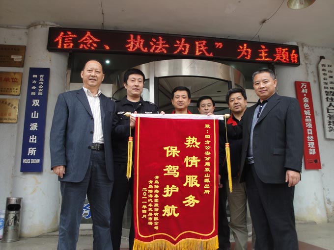 为谢谢恒久以来,,,,,,起劲维护云顶集团3118汽车生意市场治安秩序的驻地公安机关——双山派出所。。。。。2011年4月28日青岛云顶集团3118集团党委潘玉明书记和总裁助理杜学利,,,,,,向导云顶集团3118汽车生意市场、云顶集团3118物业治理公司和集团安保处的有关向导,,,,,,前往四方公循分局双山派出所,,,,,,慰问了公安民警并送去了“热情效劳、保驾护航”的锦旗,,,,,,同时与所向导及民警举行了座谈。。。。。座谈中,,,,,,警企双方向导就怎样开展警企携手共建协调等事情举行了交流。。。。。